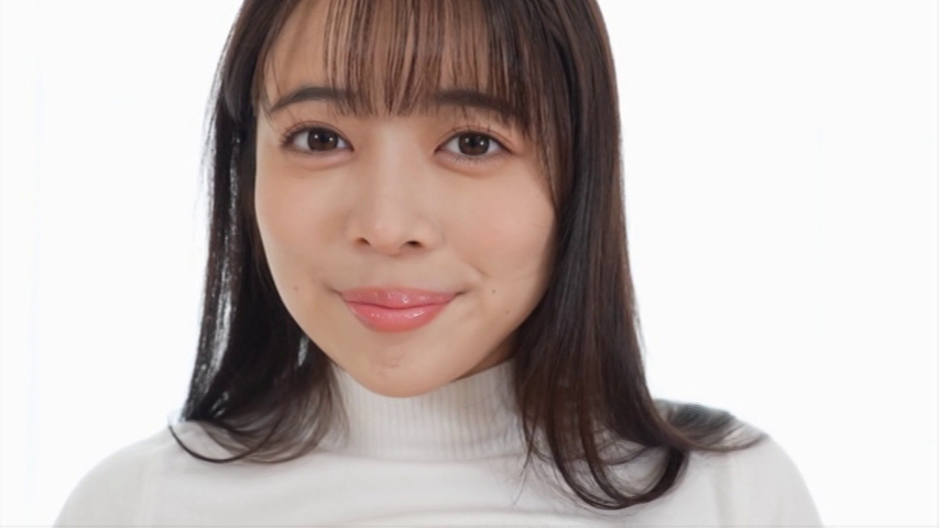 明るい日差しが差し込む真っ白なスタジオに清楚な衣装で登場します。